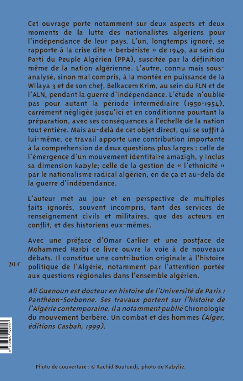 L’ouvrage qu’Ali Guenoun présente aux lecteurs est tiré de sa thèse, soutenue en septembre 2015 à l’université de Paris 1 Sorbonne. Il porte notamment sur deux aspects et deux moments, en partie interdépendants, de la lutte des nationalistes algériens pour l’indépendance de leur pays. L’un, longtemps ignoré, puis trop vite abordé, se rapporte à la crise dite « berbériste » de 1949, au sein du Parti du Peuple Algérien (PPA), suscitée par la définition même de la nation algérienne. L’autre, connu mais sous-analysé, sinon mal compris, à la montée en puissance de la Wilaya 3 et de son chef, Belkacem Krim, au sein du Front de libération nationale (FLN) et de sa branche armée (ALN), pendant la guerre d’indépendance. L’étude n’oublie pas pour autant la période intermédiaire (1950-1954), carrément négligée jusqu’ici, qui sépare la « crise » de l’insurrection du 1er novembre, et en conditionne pourtant la préparation, avec ses conséquences à l’échelle de la nation tout entière. Mais au-delà de cet objet direct, qui se suffit à lui-même, ce travail apporte une contribution importante à la compréhension de deux questions plus larges : celle de l’émergence d’un mouvement identitaire amazigh, y inclus sa dimension kabyle ; celle de la gestion de « l’ethnicité » par le nationalisme radical algérien, en deçà et au-delà de la guerre d’indépendance.